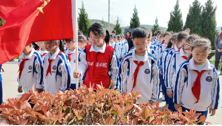 庄严肃穆,祭奠英烈寄深情 神武革命烈士墓园内,雄壮的《义勇军进行曲》奏响,全体师生脱帽肃立,齐声高唱国歌。嘹亮的歌声在陵园上空回荡,饱含着对祖国的赤诚热爱与对英烈的崇高敬意。歌声落幕,全场默哀一分钟。青山默默,松柏低垂,师生们垂首肃立,向为民族解放事业献出生命的革命先烈致以最深切的哀悼。 全体师生躬身行礼,学生代表缓步敬献花篮,每一个细节都饱含着对英烈的敬仰之情。接着,全体少先队员高举右拳,重温入队誓词。铿锵有力的誓言在陵园中久久回荡,那是新时代少年的承诺与担当。