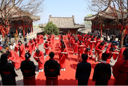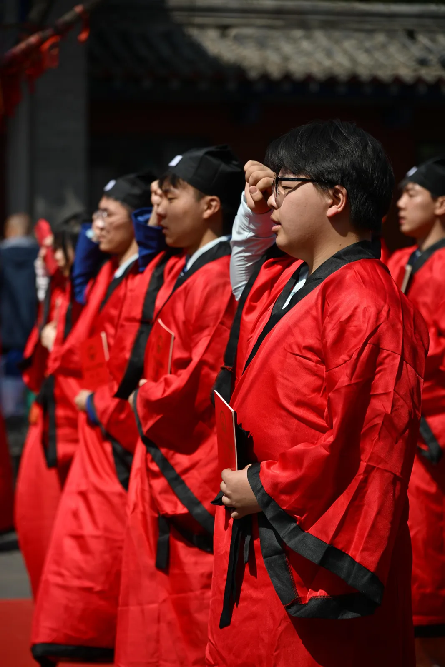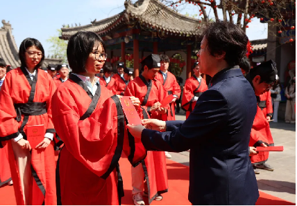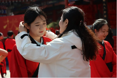 仪式在庄严的国歌声中正式拉开序幕:全体肃立,奏唱国歌,学子们目光坚定,歌声嘹亮,以赤子之心向祖国致敬;紧接着,仪式因循古礼铺展开来:奏乐沃盥、拜谒致辞、加笄加冠、奉茶拜亲、命字授印、谢师、赠书、宣誓、祈福等环节依次进行。整理衣冠以正身心,拜谒先圣致敬文脉;正宾为学子加笄加冠,长者赐字寄寓期许。正如校长张爱梅所言:“成年礼,不仅是生命的刻度,更是文明传承的契约。”学子躬身奉茶、行拜亲礼,在茶香与躬身之间,感念父母养育之恩、师长教诲之情,聆听长辈箴言,深刻体悟从少年到成人的责任与蜕变。