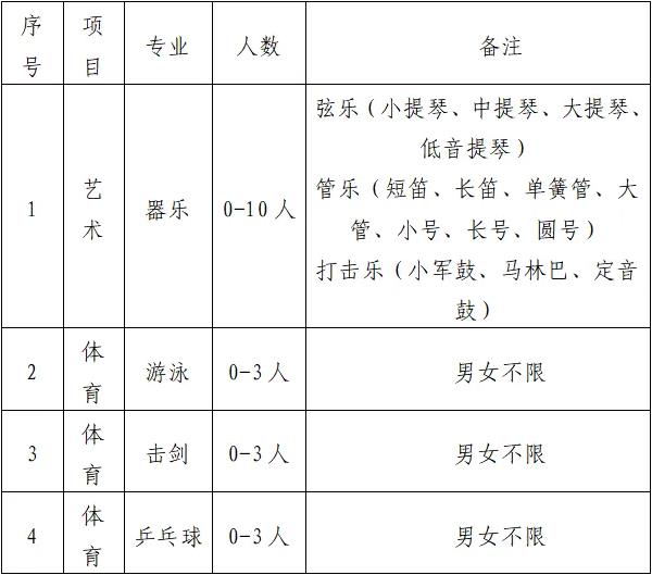 济南新航实验外国语学校隶属于山东省实验中学教育集团,不仅是一所涵盖小学、初中、高中为一体的十二年一贯制学校,更是一个深度链接学生、教师、家长的温馨家园。 自2019年建校以来,新航实验持续践行“让每一个生命都精彩绽放”理念,实行全学段小班,贯彻导师制和个性化辅导结合的精致教学,引领学生在丰富多彩的课程和张弛有度的环境中拓宽视野、发掘潜能、追求卓越,为学生提供顶尖资源支持。学校艺体课程丰富、师资配备齐全、场馆设施先进,持续为社会输送了大批优秀毕业生。 根据《2024年济南市普通高中学校招收艺体特长生工作方案》和济南市2024年高中阶段学校招生工作意见,经研究决定,2024年我校将招收艺体特长生。 一、招生计划 根据我校实际,报济南市教育局批准,我校2024年面向全市(不含莱芜、钢城)共招收艺体特长生19人,分音乐和体育两大类,具体专业及人数如下: 二、报考条件 (一)基本要求 初中综合素质评价总评等级、生物、地理学科学业水平考试成绩均须达到D 级(含)以上等级,信息技术、综合实验操作、音乐、美术、综合实践均须达到“合格”且有体育或艺术特长的应届初中毕业生。 (二)专业要求 1.音乐:在初中阶段参加国家及省、市、区县教育主管部门举办的艺术比赛中取得优异成绩或具有同等艺术水平的应届初中毕业生(提供有效获奖证书),且有一定演出经验(提供演出现场照片),男女不限。接受过系统的专业训练,熟练并独立演奏有一定难度的曲目,有很好的专业技术与表现能力,且有较熟练地视奏能力。 备注:所有项目择优录取,考生可兼报测试项目中的两项。 2.游泳:初中阶段在教育或体育主管部门举办的比赛中获得市级以上(含市级)游泳比赛单项前三名(提供有效证书)或成绩达到国家二级运动员及以上标准,或有发展潜力的优秀学生。至少掌握两种以上泳姿。 3.击剑:初中阶段获得省以上级别比赛个人前三十二名或团体前八名或初中阶段获得市级击剑比赛个人前十六名运动员或有潜力的优秀学生。 4.乒乓球:初中阶段在教育或体育主管部门组织并获得市赛团体/单项前六名,或者省赛团体/单项前八名,或者全国比赛团体/单项前十六名的学生或有潜力的优秀学生。 三、报名和专业测试 (一)报名及资格审查 2024年我校特长生招生全部实行现场报名,专业老师将会对各位同学携带的报名材料进行审核,审核合格予以报名、发放准考证。 1.报名时间:6月16日、6月17日每天8:30-17:00 2.报名地点:济南新航实验外国语学校图书馆三楼 3.报名材料: (1)居民身份证等有效身份证件 (2)相关等级证书、获奖证书、演出视频或节目单等证明材料(报名时以上材料需携带原件及复印件一份) (3)1寸彩色近期免冠照片3张。 (二)专业测试内容及标准 1.器乐 (1)音乐素养测试: 视奏:视奏乐谱 听音模唱:单音,音程 (2)自备作品展示2分钟内 ①自带乐器独奏,不能用音频、视频或钢琴等其他任何乐器现场伴奏。 ②考生提供自选曲目的乐谱一式三份。 ③在测试中评委有权打断考生的表演,并指定考生表演作品或剧目中的任意一个段落或部分。 ④现场报名上交获奖证书或演出照片与现场测试乐器要一致,否则取消测试资格。 2.体育 (1)游泳: 100m专项测试(蝶/仰/蛙/自,四选一,包含跳出发,转身)。 考试采用一次性决赛,使用手计时计取成绩,参照评分标准换算成得分(比赛成绩占比90%,技术评定占比10%)。手计时每道两名计时员计取成绩,取相同值或中间值为最终成绩。 备注:自带泳衣、泳镜、泳帽等必需用品。 (2)击剑: 体能:立定跳远、单摇跳绳 专项技术:弓步技术、攻防技术、实战 (3)乒乓球:学生根据报名顺序进行排号,一个大组进行单打循环赛,五局三胜制。 四、专业测试时间、地点 (一)测试时间:6月27日上午 (二)测试地点: 游泳-游泳馆 击剑-体育馆二楼 乒乓球-体育馆二楼 器乐-黑匣子剧场 请考生携带居民身份证、准考证、专业测试所需物品8:30前到济南新航实验外国语学校体育馆集合,按项目进行排队。 五、专业测试合格名单公示 专业测试合格人数按不超过特长生招生计划数的1.5倍确定,测试合格考生名单经市教育局审批,通过学校网站公示三天后发放合格证。 六、录取条件 取得我校专业测试合格证的考生,录取时按照非推荐生试点校政策,艺术类考生初中学业水平考试成绩达到济南市普通高中志愿填报资格线下30分(含)以上;体育类考生初中学业水平考试成绩达到济南市普通高中志愿填报资格线下50分(含)以上。同时必须满足初中综合素质评价总评等级、生物、地理、道德与法治、历史学科学业水平考试成绩均须达到D级(含)以上等级,信息技术、综合实验操作、音乐、美术、综合实践均须达到“合格”。在专业测试合格的人员中,严格按照考生成绩和录取人数,从高分到低分择优录取。 七、特别声明 (一)根据《2024年济南市普通高中学校招收艺体特长生工作方案》要求,若招生项目出现空缺或该项目考生专业测试成绩未达到学校招生最低标准,经学校招生工作小组研究,将该项目招生计划进行调整或缩减招生计划。 (二)凡经我校录取的艺体特长生,入校后须代表学校参加有关比赛活动。 (三)我校艺体特长生招生,不委托任何机构举办考前专业辅导班。 招生咨询电话:0531-59516633 音乐:闫老师15069091739 游泳:乔老师 18221056015 击剑:高老师1866