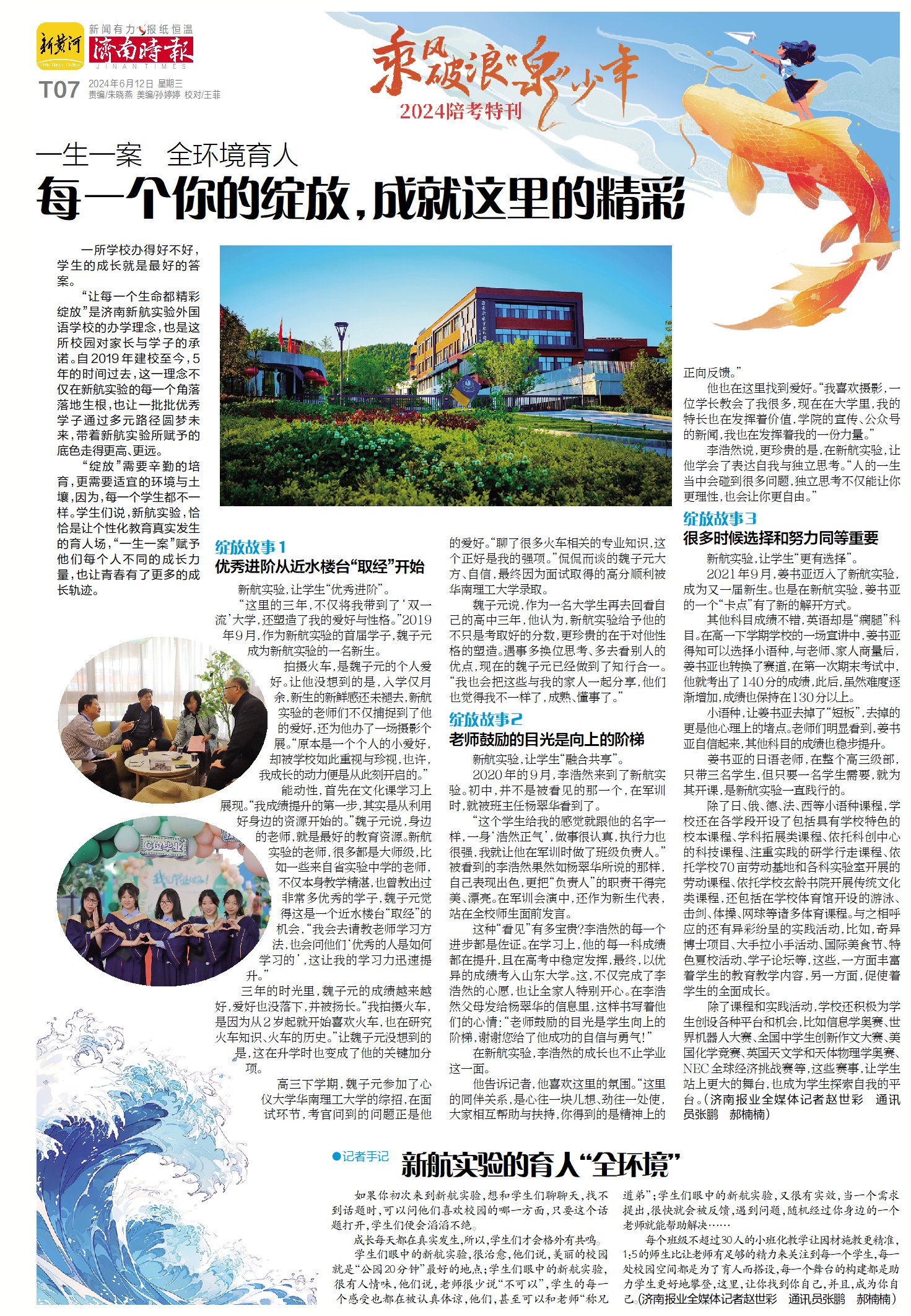 一所学校办得好不好,学生的成长就是最好的答案。 “让每一个生命都精彩绽放”是济南新航实验外国语学校的办学理念,也是这所校园对家长与学子的承诺。自2019年建校至今,5年的时间过去,这一理念不仅在新航实验的每一个角落落地生根,也让一批批优秀学子通过多元路径圆梦未来,带着新航实验所赋予的底色走得更高、更远。 “绽放”需要辛勤的培育,更需要适宜的环境与土壤,因为,每一个学生都不一样。学生们说,新航实验,恰恰是让个性化教育真实发生的育人场,“一生一案”赋予他们每个人不同的成长力量,也让青春有了更多的成长轨迹。 绽放故事1 优秀进阶从近水楼台“取经”开始 新航实验,让学生“优秀进阶”。 “这里的三年,不仅将我带到了‘双一流’大学,还塑造了我的爱好与性格。”2019年9月,作为新航实验的首届学子,魏子元成为新航实验的一名新生。 拍摄火车,是魏子元的个人爱好。让他没想到的是,入学仅月余,新生的新鲜感还未褪去,新航实验的老师们不仅捕捉到了他的爱好,还为他办了一场摄影个展。“原本是一个个人的小爱好,却被学校如此重视与珍视,也许,我成长的动力便是从此刻开启的。” 能动性,首先在文化课学习上展现。“我成绩提升的第一步,其实是从利用好身边的资源开始的。”魏子元说,身边的老师,就是最好的教育资源。新航实验的老师,很多都是大师级,比如一些来自省实验中学的老师,不仅本身教学精湛,也曾教出过非常多优秀的学子,魏子元觉得这是一个近水楼台“取经”的机会,“我会去请教老师学习方法,也会问他们‘优秀的人是如何学习的’,这让我的学习力迅速提升。” 三年的时光里,魏子元的成绩越来越好,爱好也没落下,并被扬长。“我拍摄火车,是因为从2岁起就开始喜欢火车,也在研究火车知识、火车的历史。”让魏子元没想到的是,这在升学时也变成了他的关键加分项。 高三下学期,魏子元参加了心仪大学华南理工大学的综招,在面试环节,考官问到的问题正是他的爱好。“聊了很多火车相关的专业知识,这个正好是我的强项。”侃侃而谈的魏子元大方、自信,最终因为面试取得的高分顺利被华南理工大学录取。 魏子元说,作为一名大学生再去回看自己的高中三年,他认为,新航实验给予他的不只是考取好的分数,更珍贵的在于对他性格的塑造。遇事多换位思考、多去看别人的优点,现在的魏子元已经做到了知行合一。“我也会把这些与我的家人一起分享,他们也觉得我不一样了,成熟、懂事了。” 绽放故事2 老师鼓励的目光是向上的阶梯 新航实验,让学生“融合共享”。 2020年的9月,李浩然来到了新航实验。初中,并不是被看见的那一个,在军训时,就被班主任杨翠华看到了。 “这个学生给我的感觉就跟他的名字一样,一身‘浩然正气’,做事很认真,执行力也很强,我就让他在军训时做了班级负责人。”被看到的李浩然果然如杨翠华所说的那样,自己表现出色,更把“负责人”的职责干得完美、漂亮。在军训会演中,还作为新生代表,站在全校师生面前发言。 这种“看见”有多宝贵?李浩然的每一个进步都是佐证。在学习上,他的每一科成绩都在提升,且在高考中稳定发挥,最终,以优异的成绩考入山东大学。这,不仅完成了李浩然的心愿,也让全家人特别开心。在李浩然父母发给杨翠华的信息里,这样书写着他们的心情:“老师鼓励的目光是学生向上的阶梯,谢谢您给了他成功的自信与勇气!” 在新航实验,李浩然的成长也不止学业这一面。 他告诉记者,他喜欢这里的氛围。“这里的同伴关系,是心往一块儿想、劲往一处使,大家相互帮助与扶持,你得到的是精神上的正向反馈。” 他也在这里找到爱好。“我喜欢摄影,一位学长教会了我很多,现在在大学里,我的特长也在发挥着价值,学院的宣传、公众号的新闻,我也在发挥着我的一份力量。” 李浩然说,更珍贵的是,在新航实验,让他学会了表达自我与独立思考。“人的一生当中会碰到很多问题,独立思考不仅能让你更理性,也会让你更自由。” 绽放故事3 很多时候选择和努力同等重要 新航实验,让学生“更有选择”。 2021年9月,姜书亚迈入了新航实验,成为又一届新生。也是在新航实验,姜书亚的一个“卡点”有了新的解开方式。 其他科目成绩不错,英语却是“瘸腿”科目。在高一下学期学校的一场宣讲中,姜书亚得知可以选择小语种,与老师、家人商量后,姜书亚也转换了赛道,在第一次期末考试中,他就考出了140分的成绩,此后,虽然难度逐渐增加,成绩也保持在130分以上。 小语种,让姜书亚去掉了“短板”,去掉的更是他心理上的堵点。老师们明显看到,姜书亚自信起来,其他科目的成绩也稳步提升。 姜书亚的日语老师,在整个高三级部,只带三名学生,但只要一名学生需要,就为其开课,是新航实验一直践行的。 除了日、俄、德、法、西等小语种课程,学校还在各学段开设了包括具有学校特色的校本课程、学科拓展类课程、依托科创中心的科技课程、注重实践的研学行走课程、依托学校70亩劳动基地和各科实验室开展的劳动课程、依托学校玄龄书院开展传统文化类课程,还包括在学校体育馆开设的游泳、击剑、体操、网球等诸多体育课程。与之相呼应的还有异彩纷呈的实践活动,比如,奇异博士项目、大手拉小手活动、国际美食节、特色夏校活动、学子论坛